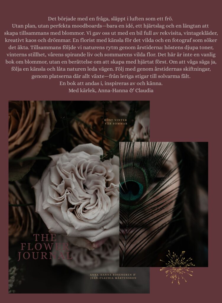 I ett år fotograferade vi och samlade alla bilderna i vår lilla skattkista, genom årets alla säsonger. Det var en utmaning i sig att försöka plocka ut alla favoriterna och det finns ett par tusen underbara bilder kvar som inte visas i boken. Det roligaste har nog varit att formgiva boken och få ihop bilder, texter och designen. Jag är så otroligt tacksam över att få gjort denna resan med floristen/stylisten Anna-Hanna Rosengren och det finns ingen annan som jag skulle kunna gjort denna kreativa resan med så enkelt och så fullt med kärlek och energi. Inget har skapats från perfekta planerade moodboards utan vi båda skapar bäst i den kreativa kaosen och det som händer i stunden. Vi har samma bilder och känsla i tankarna vilket är unikt att få skapa tillsammans utifrån det. Tack för ett äventyr som bar till en massa vackra platser både häromkring och i Paris, Köpenhamn. Och inte minst massor av skratt och glädje, vi hade kunnat skriva en bok om att göra boken för allt galet händer på våra fotograferingar.